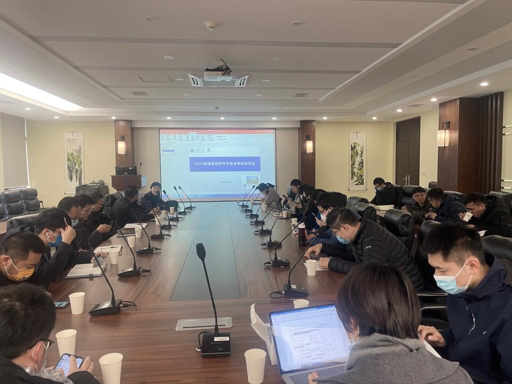 在学院B222召开2023年度国家自然科学基金申报动员暨辅导会。会上邀请了学校科学技术研究院王维懿做辅导报告,学院30余名教师参会,副院长樊启高教授主持并做动员讲话。