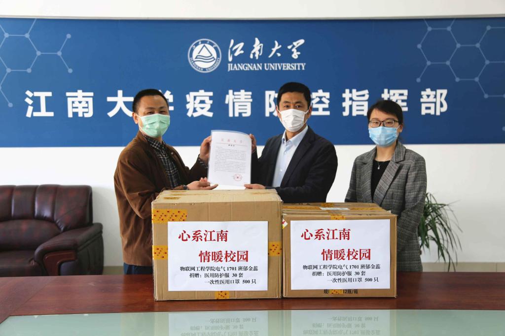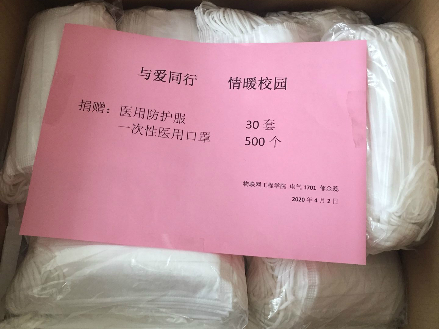 新冠肺炎疫情暴发以来,广大物联学子时刻心系母校。近日,为积极配合学校做好复学准备工作,全力保障开学后我校师生的健康和安全,电气1701班的郁金蕊同学无偿为母校捐赠30套防护服和500只一次性医用口罩,用自己的实际行动为母校的疫情防控工作助力。