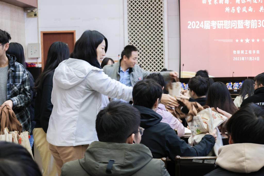 活动过半,学院党政领导同与会班主任、辅导员为考研学生代表送上学院精心准备的考研加油包。“励志加油包”祝福同学们都能就此扬“帆”起航,心想事成,一战成硕;“文具助力包”希望同学们在考场上妙笔生花,金榜题名;“能量补给包”期待同学们暖冬心事成,幸运伴你行,“橙”功上岸;“幸运锦鲤包”带着班主任、辅导员和保研同学的满满祝福,祝愿同学们锦鲤附体,考的全会,逢考必过。