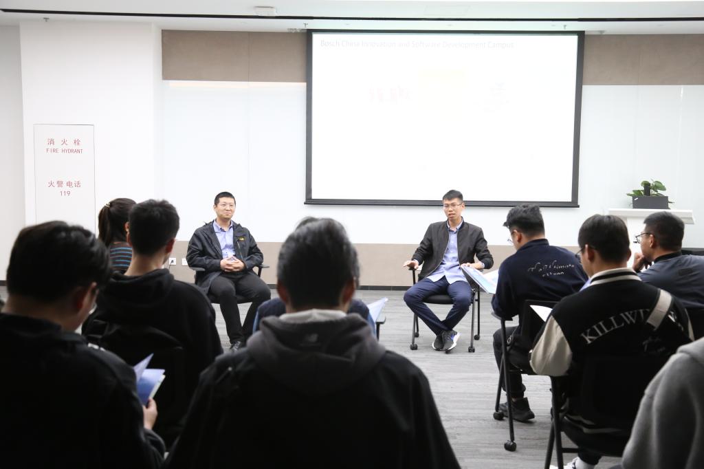 的校友代表陈家乐、段飞腾分享了自己的求职经验、在博世的工作体验和行业发展趋势,并与学生就自动驾驶、智能座舱等方面进行了技术交流探讨,让学生们更加真实地感受到企业的工作环境和就业前景。学生们也积极与学长交流,提出了自己在专业学习、职业发展等方面的问题,获得了专业的指导和建议。