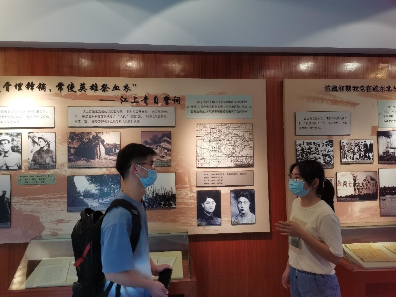 “史岭红梅花沥血,芦沟晓月天飞鹤。”踏入陈列馆,一首《满江红》带我们走进了江上青烈士教书育人、抗日救亡、血洒皖东北、赤子报国的一生。从一件件弥足珍贵的历史文物、一幅幅记录峥嵘岁月的图片、一个个感人至深的革命故事中,实践团成员真切感受江上青烈士矢志不渝救亡图存的满腔热血,深刻体悟江上青烈士积极投身革命事业,融入时代洪流的坚定信念。值得一提的是,实践团成员在寻访过程中还遇到了扬州大学社会实践团队并与扬州大学的同学互相交流学习心得和感想。