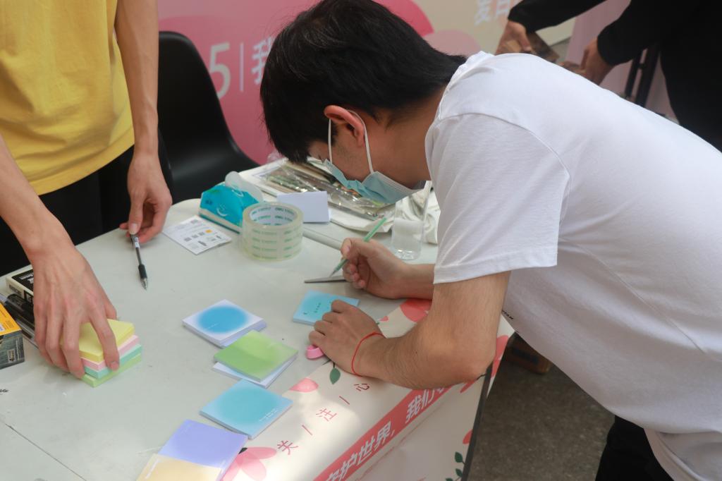 活动设有“心声伊甸园”“温暖的抱抱”“定格一笑”“心灵加油站”等环节。“心声伊甸园”设置“心愿便利贴”和“烦恼宣泄箱”两个环节,参加活动的同学将对未来学习生活的美好期待、对师长的真诚祝福、对自我的认可激励、对职场生活的期待、对过去的释怀等写在便利贴上,展现在心愿墙上;将心中的压抑苦闷、不满情绪、烦恼纠结等化作手中的纸团,扔进烦恼宣泄箱中,让心中烦闷情绪得以排解与舒缓。现场玩偶展开怀抱,给每一位同学送去温暖的拥抱,这个拥抱,是陌生人的善意、是给予的鼓励、是失落的安慰……“心灵加油站”设置了精彩有趣、内容丰富的心理知识问题,同学们通过回答问题,不仅丰富了心理健康知识,还能收获奖品。