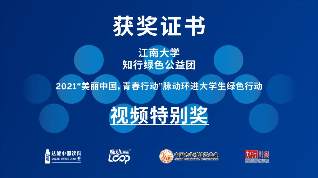 “知行绿色”大学生公益团在2021年“美丽中国,青春行动”脉动环进大学生绿色行动中获全国金奖(全国唯一)、视频特别奖。公益团主要成员由91探花
