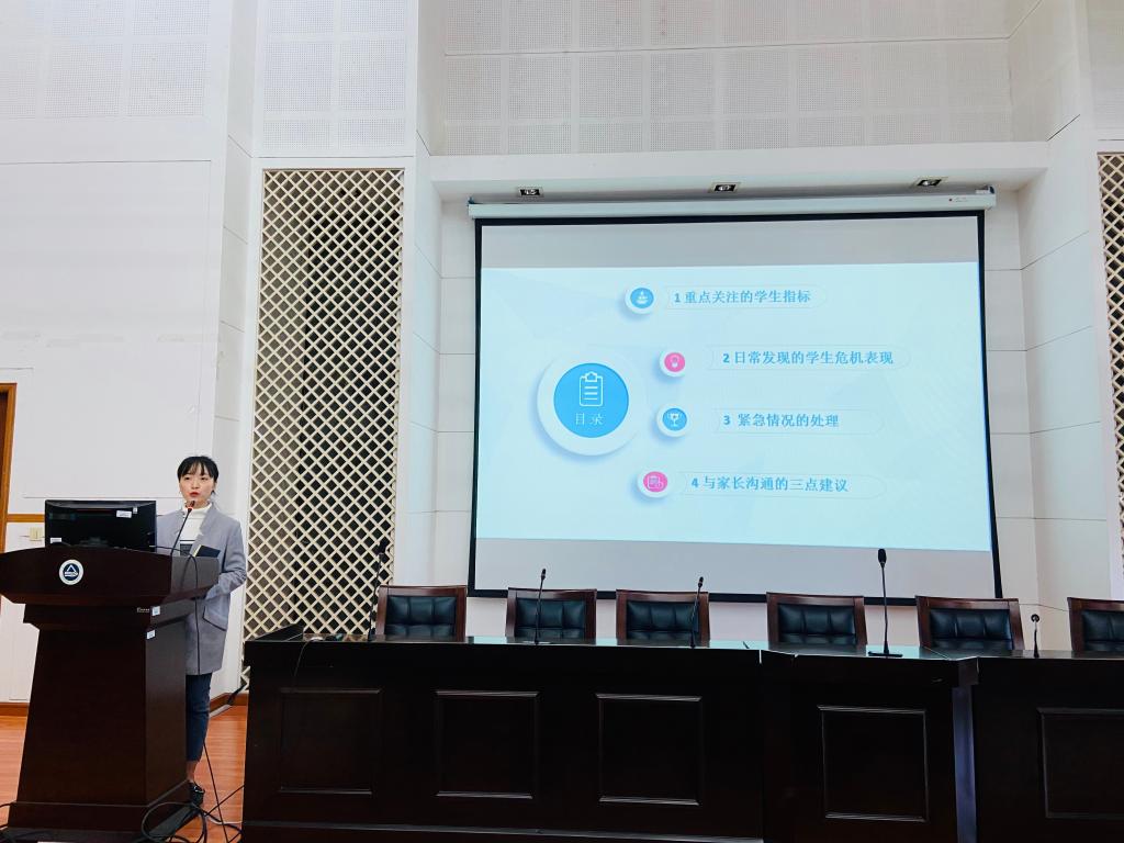 会议伊始,孔丽丹由最近几起自杀事件切入话题,围绕自杀行为及其影响,提醒各位老师要正确认识和了解当代大学生的心理健康问题,重视心理育人工作,在掌握必备的心理知识基础上,协同辅导员队伍共同做好大学生心理健康教育工作。随后,国家二级心理咨询师、辅导员吴迪就关注大学生心理健康状态,提升辨别和应对大学生常见心理问题的能力开展了题为《大学生心理危机的识别和应对》的讲座。