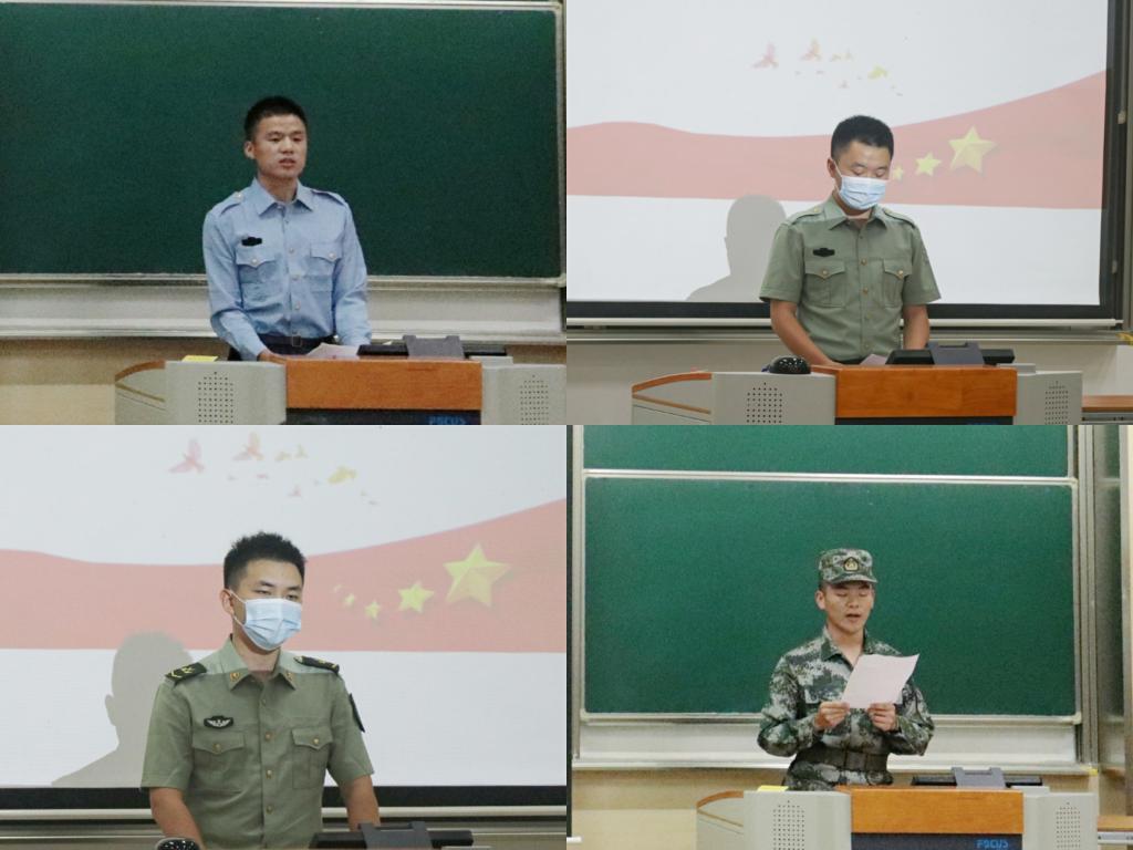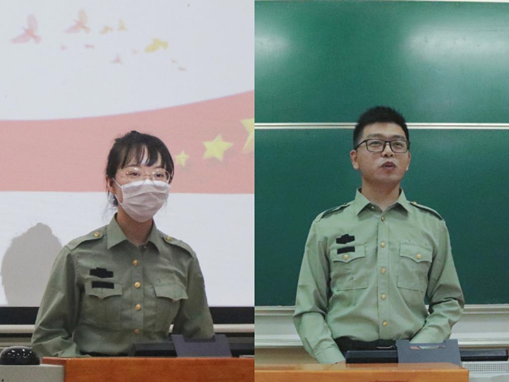 紧接着,退伍学生代表进行发言。他们先是回顾了自己激昂的军旅岁月,侯梦涛说,在军队的生活是最艰难的,自己吃了很多未曾吃过的苦;周宇胤说,在部队中,“千条万路虽辛苦,吹尽黄沙始到金”成为了他坚定的人生信条,为了成为一名合格的军人,他总是加倍完成训练,以期实现高效率的进步与提升。但同时,退伍学生也不约而同地认为,迷彩青春也给了他们前所未有的经历体验和收获,刘珂说,军旅生活虽是艰难的,可咬咬牙挺过去就能受益匪浅,正在这个过程中他学会了勇敢、自律与坚持;程子强则鼓励即将参训的新生们,义无反顾地迎接军训的考验,突破自己,勇往直前。