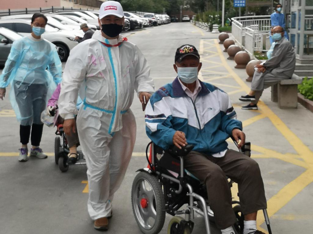 叶尔江·哈力木扶着老人做核酸检测