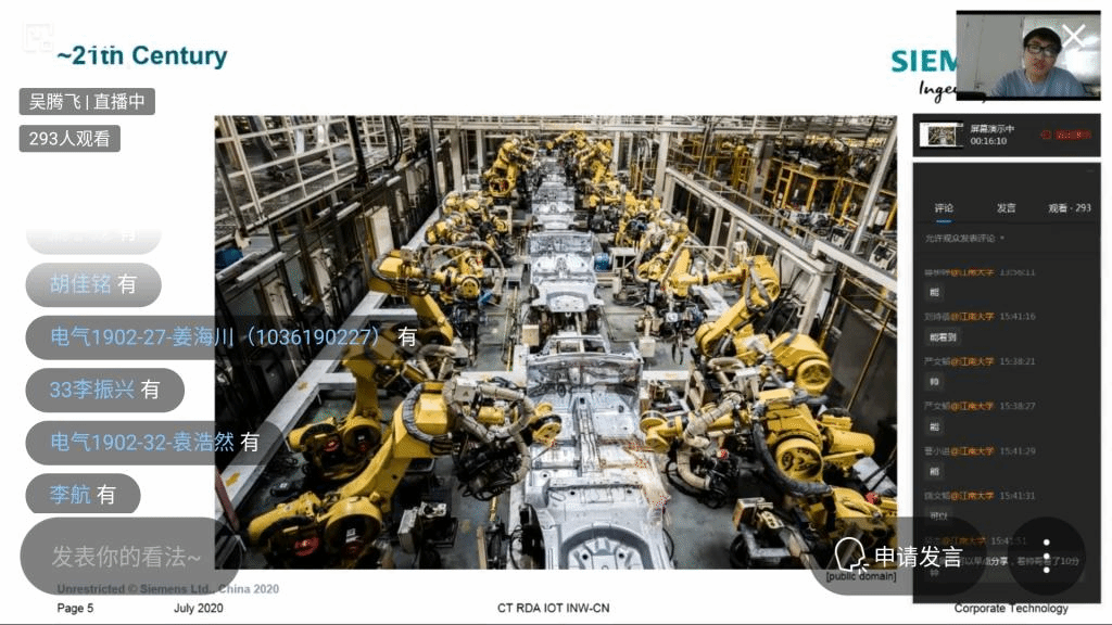 第57期唯实讲坛在企业微信平台顺利开展。本次讲坛的主题为“5G for Industry”,邀请了来自西门子中国研究院无锡创新中心的吴腾飞先生作为主讲人。吴腾飞先生于2015年起就职于西门子中国研究院无锡创新中心,具有多年工业通信及边缘计算研发经验,目前主要从事5G技术在工业领域中的创新和应用,主笔或参与申报多篇国际发明专利。