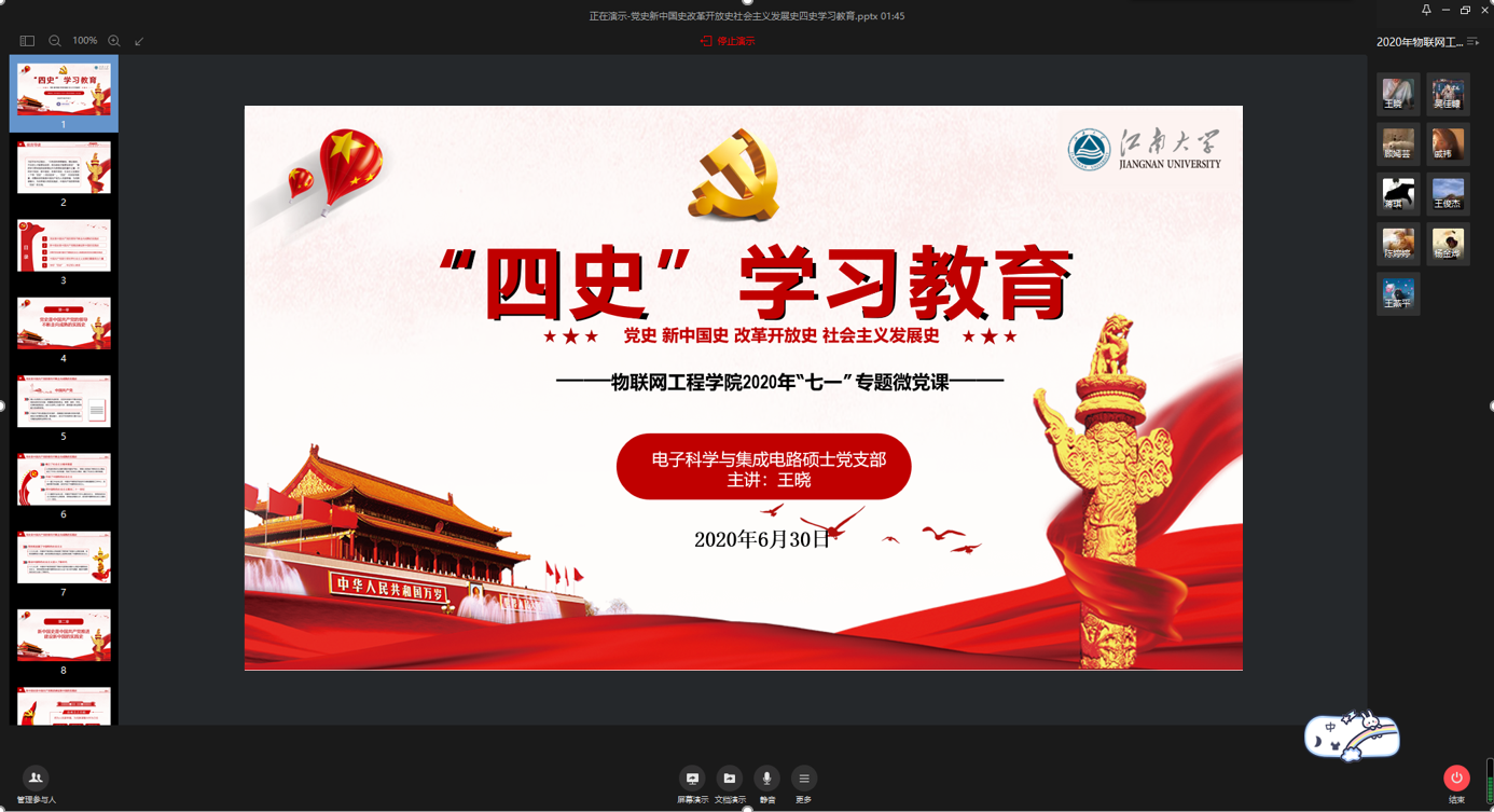 全体学生党支部通过线上线下相结合举办“讲战疫故事·迎党的生日”主题微党课,学生党支部书记、党员代表以小故事讲大道理,深入浅出,有思考,有温情,有创意,充分展现新时代物联学生党员的忠诚与担当。