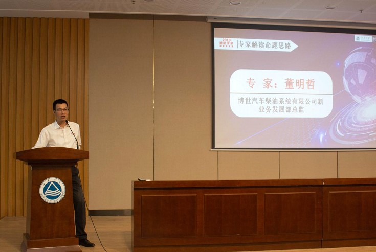 随后,主办方为同学们做了有关本次赛事的详细介绍并公布了赛题。本届赛事围绕“智能制造与物联网应用”这个核心主题,下设“智能生活、智能交通、环境保护、智能工农业”等四大领域,参赛学生可以任选一个领域进行创新,提出一个新颖且可实现的创意,最终形成包含创意内容、实现方案、应用前景等内容的设计报告,或设计、制作一个具有一定功能和应用价值的物联网产品原型。为使参赛学生更准确把握赛事主题,特邀博世汽车柴油系统有限公司新业务发展部总监董明哲从出题专家的角度解读命题思路,他结合实际工程和同学们分享了许多创新的实例。第二届获奖团队代表石秋婷从选题、团队建设、资料收集、心得体会等方面进行了专题分享。