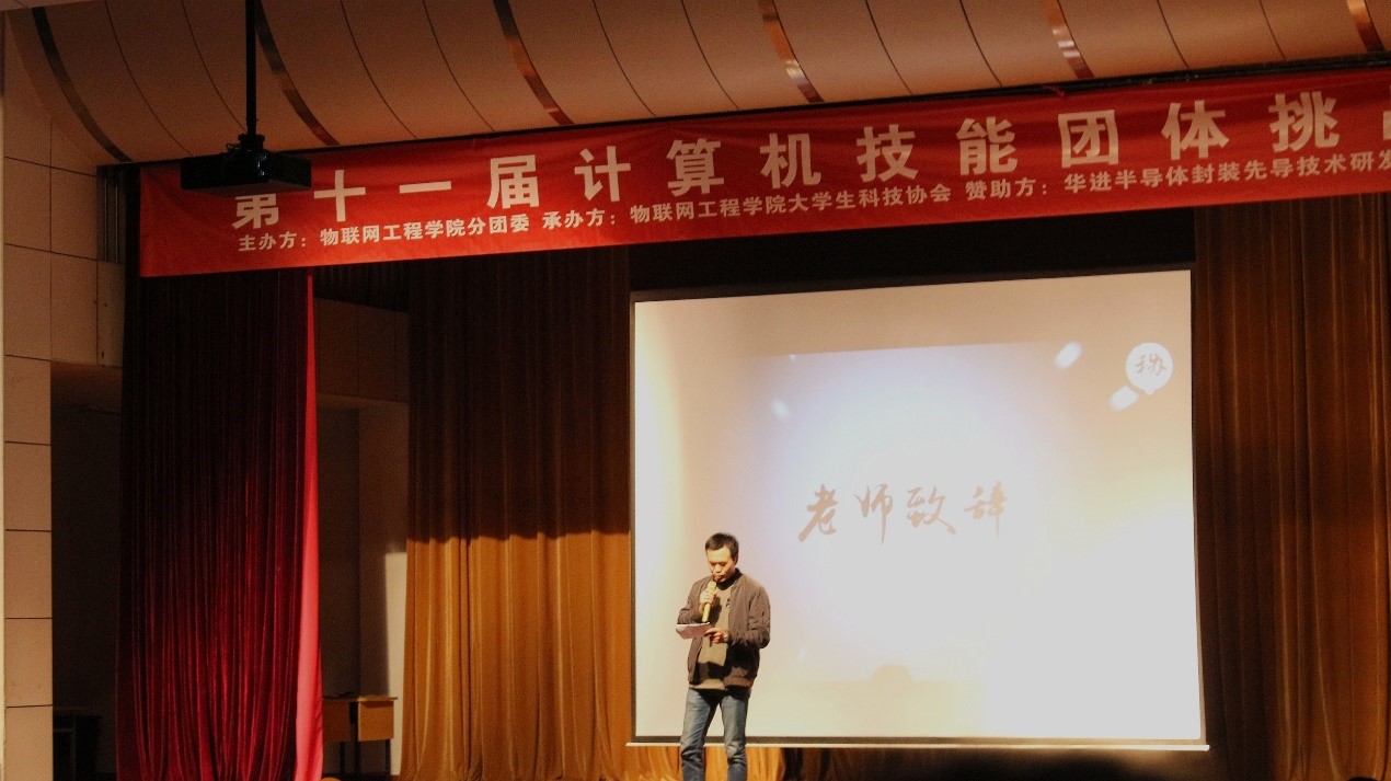 分团委书记吴垚致开幕词并宣布决赛正式开始,他的致辞表达了对团挑寄予的美好希冀,同时他也表示希望能有更多的同学了解团挑、参加团挑,使计算机软硬件知识得到更大程度的普及。