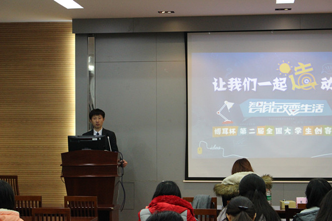 首先王乐女士对博尔杯创客大赛进行介绍,较往届大赛,本届大赛带给了高校学子们更大的创新创意空间。除了在技术竞赛环节,本届的外观设计竞赛环节也特别引人注目,赛中涌现出的创新成果,将有机会对接包括博耳电力在内的众多科技企业和优质社会资本,以帮助学生将象牙塔中的方案和闪光的“点子”转化为更具发展前景的产品,从而获得更广阔的商业化空间。接着王正山先生对创客大赛的命题进行解读,并与同学们分享了两个物联网应用案例。其次获得首届大赛铜奖的团队代表刘硕,用他们的大赛实践经验鼓励着学弟学妹们为梦想“造”动起来,当谈到获奖时,他幽默地说:“我们只是一个一不小心就获奖了。”其实在“不小心”的背后,团队的付出一点都不轻松。最后吴垚老师对全体参加宣讲会的成员进行了参赛动员。