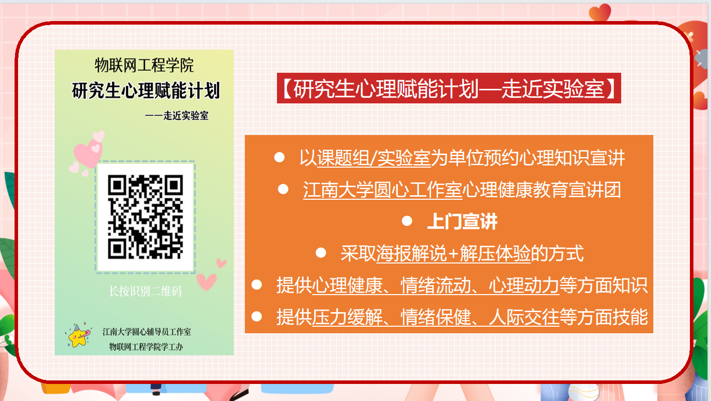 圆心辅导员工作室“爱心”实践团组织开展的研究生心理赋能计划以及预约方式,希望通过“上门宣讲+互动体验”的直观形式,进一步助力以课题组为交际单位的理工科研究生的积极心理素质培育。