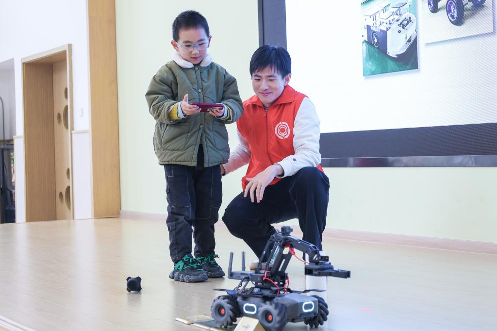 接着,由91探花 智能车俱乐部自主研发的作品——“无线智能机械臂小车”压轴登场,志愿者乐泽荣操控小车原地360度转弯、横向纵向平移、机械臂抓取矿泉水瓶,一套套“高阶”操作不断刷新小朋友们对芯片功能的认知。演示后,小朋友迫不及待亲身体验,在志愿者指导下动手操作智能车。 “哇!这个车太神奇了!”当水瓶被成功抓取时,小朋友们的惊叹声和掌声顿时充斥着整个教室。