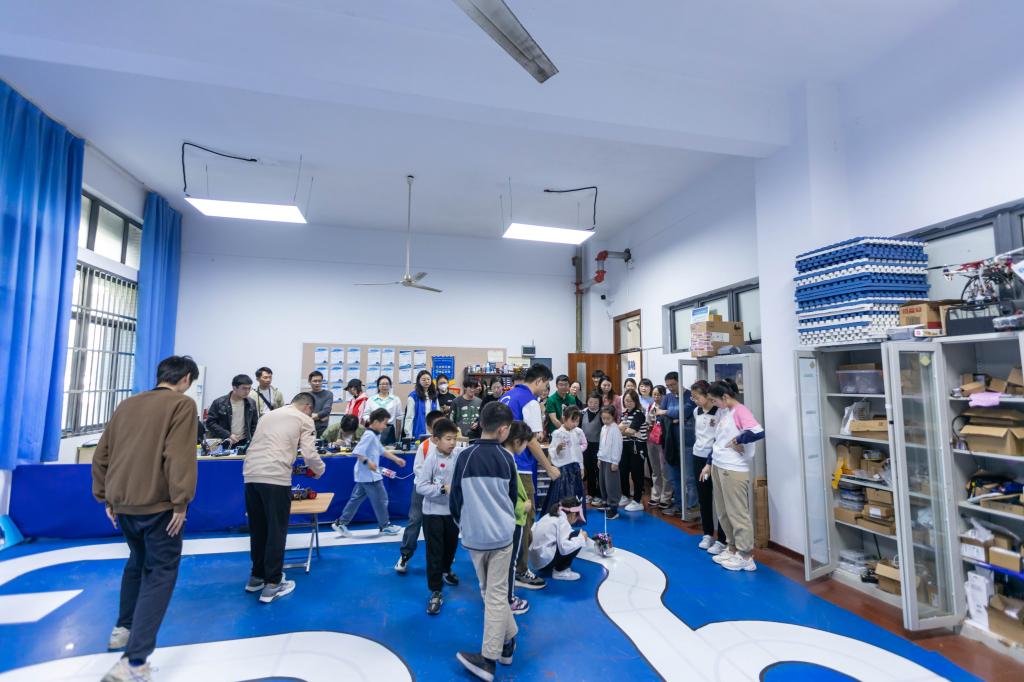 物联网大学生创新实践基地是此次研学的亮点。“小博世”们在电子设计俱乐部亲眼见证了电路板在智能系统中的重要作用,感受到电学的魅力。“这些小车为什么会沿着黑线行走?”“它们如何感知到颜色的差别?”“这些代码分别起到了怎样的作用?”在物联网创新应用俱乐部和智能车俱乐部中,“小博世”们发出了不少疑问。讲解员耐性地为他们解决了疑惑。在不断的交流互动中,“他们汲取科学知识,感悟创新精神,科学思维得到了极大的提升。
