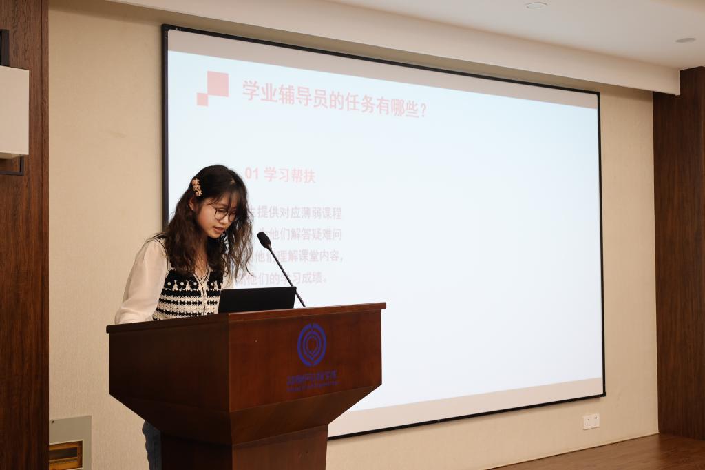 吕文娟作为优秀学业辅导员代表,从“做好学业辅导员的前提”“帮扶工作的具体任务”“课程辅导的方法与技巧”“解决辅导过程中的困难”四个方面分享心得体会。她认为,学业辅导员自身应当具备高度的责任感、过硬的专业知识和良好的沟通能力,应该根据不同学生的学习情况和个性特点量身制定学习计划、提供具体建议,并持续跟踪反馈。此外,她结合自身工作案例,对帮扶过程中可能面临的诸多挑战提出了总结形成的应对和解决办法。