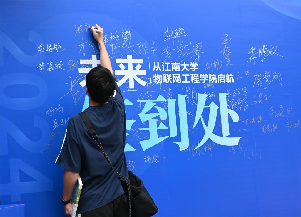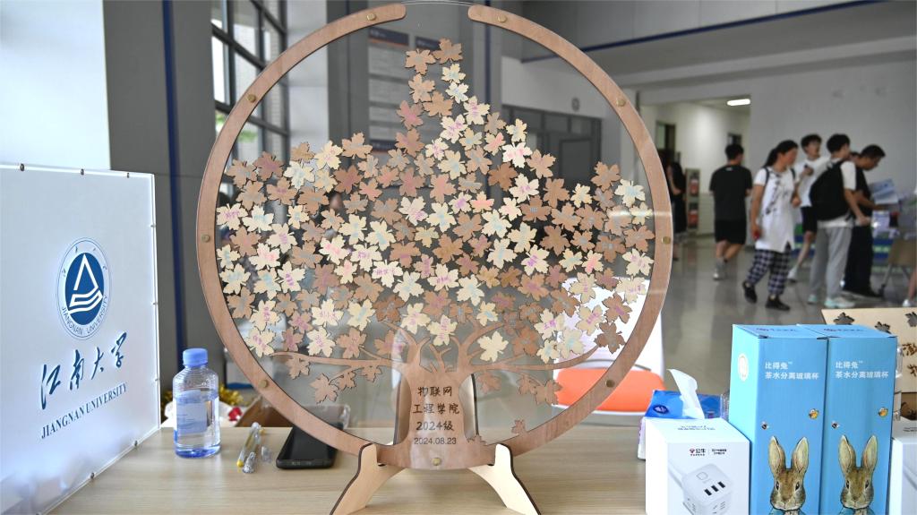 报到现场,设置了三个特色体验区。展板区设置“未来签到处”创意签名墙,为刚刚踏入校园的新生锚下独特而富有意义的起点;“科创体验区”汇聚了物联学子在历届科创竞赛中的杰出成果,新生亲自上手操作体验,点燃科创热情;“心愿抽奖区”通过手写寄语的温馨方式赋予每位新生一次特别的抽奖机遇,一笔一划承载着对未来的美好祝愿,精心设计的文创奖品更传递了深厚的学院文化,让新生收获归属感与认同感。此外,学院还组织起一支热心的志愿者服务队,穿梭于报到现场与宿舍园区,耐心地向新生提供引导、指示和答疑等服务,用实际行动传递着学院最真挚的关怀与温暖的问候。