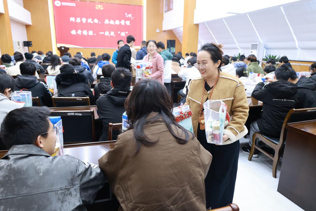 随后,学院党政领导同与会班主任、辅导员老师为考研学生代表送上学院精心准备的考研加油包,每个加油包中包含十件礼物,每一个礼物背后都有其独特的含义,都承载着学院对考研学子们的最深切的祝福和最温暖的慰问。物联心协在考研慰问会场前,举行了“逐梦研途,砥砺前行”心理健康教育小活动,通过抽取惊喜盲盒、兑换祝福卡片的趣味形式吸引大家驻足参与,在轻松愉悦的氛围中为学长学姐缓解考研焦虑、送上祝福和鼓励。