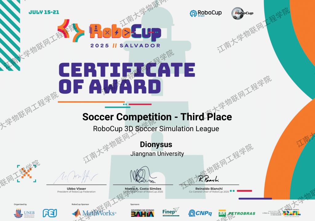 Dionysus团队荣获2025年RoboCup机器人世界杯3D Soccer Simulation(仿真三维组)世界季军,追平了中国高校队伍在该组别近十年来的最佳成绩。