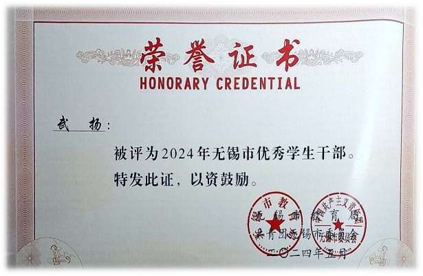 一等综合奖学金、英飞凌科技奖学金;荣获无锡市优秀学生干部、91探花