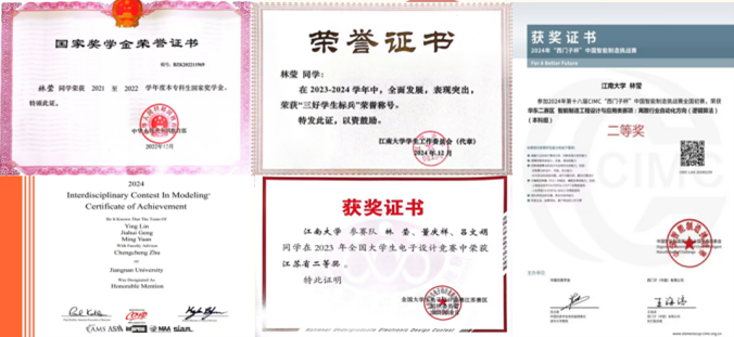 优秀共青团员等荣誉称号;取得美国大学生数学建模竞赛二等奖、西门子智能制造挑战赛江苏省二等奖、全国大学生电子设计竞赛江苏省二等奖等竞赛奖项。现已推免至中国科学技术大学自动化系。