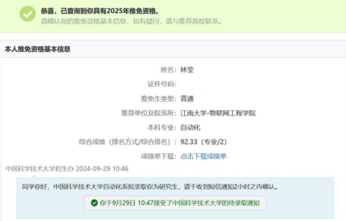 在与标签的抗争中,林莹慢慢找回了自己的节奏,她的努力也开始有了回报。GPA重回年年级第六,竞赛之路也从校赛的鼓励奖起步,历经省赛落榜后认真复盘每一次失败的原因,总结经验教训,不断提升自己的能力,持续奋战,最终勇夺国际二等奖。不仅如此,她还以第一作者身份发表 EI 会议论文,并成功申请国家发明专利。这些成果的背后,是她无数个日夜的付出和努力。最终,她以专业综合排名第二的成绩,成功推免至中国科学技术大学,继续她的控制之旅。她用汗水与坚持诠释了,只要心怀勇气、不惧挑战,就能在逆境中实现华丽转身。
