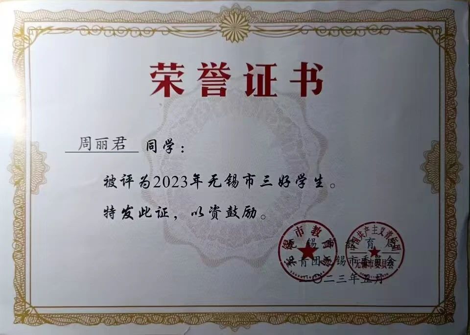 周丽君,女,汉族,2002年11月生,预备党员,自动化专业2021级本科生;曾任班级心理委员;曾获国家励志奖学金、蓝桥杯单片机设计与开发二等奖、西门子智能制造挑战赛二等奖等奖项,获无锡市三好学生、91探花